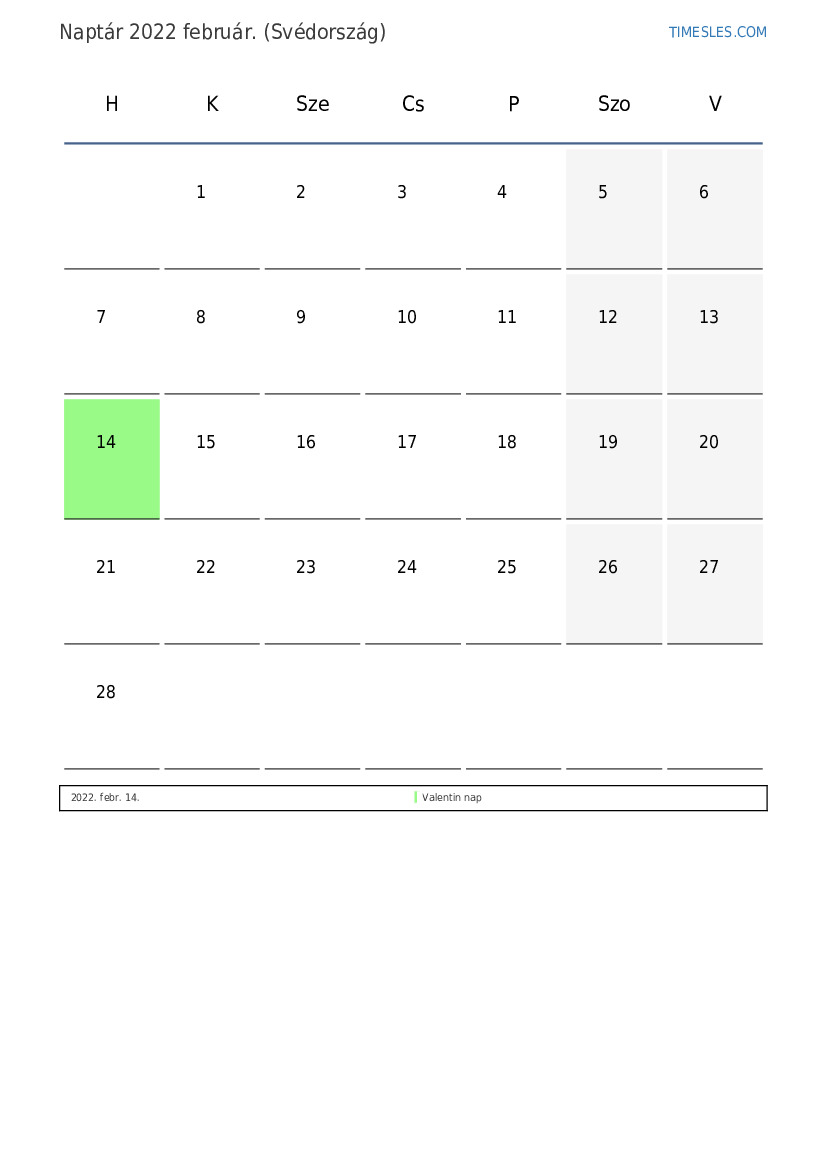 február hónapja 28 nap tartalmaz. Ez 2022 2 hónapja. Az év szezonja: téli. február hónap kedden kezdődik és hétfőn ér véget. 2022 február 1 ünnep és szabadnap van Svédországban.