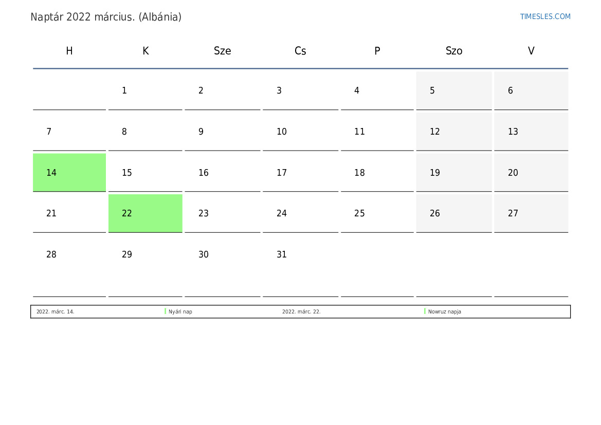 Ünnepek és hétvégi naptár 2022 március Albánia számára
