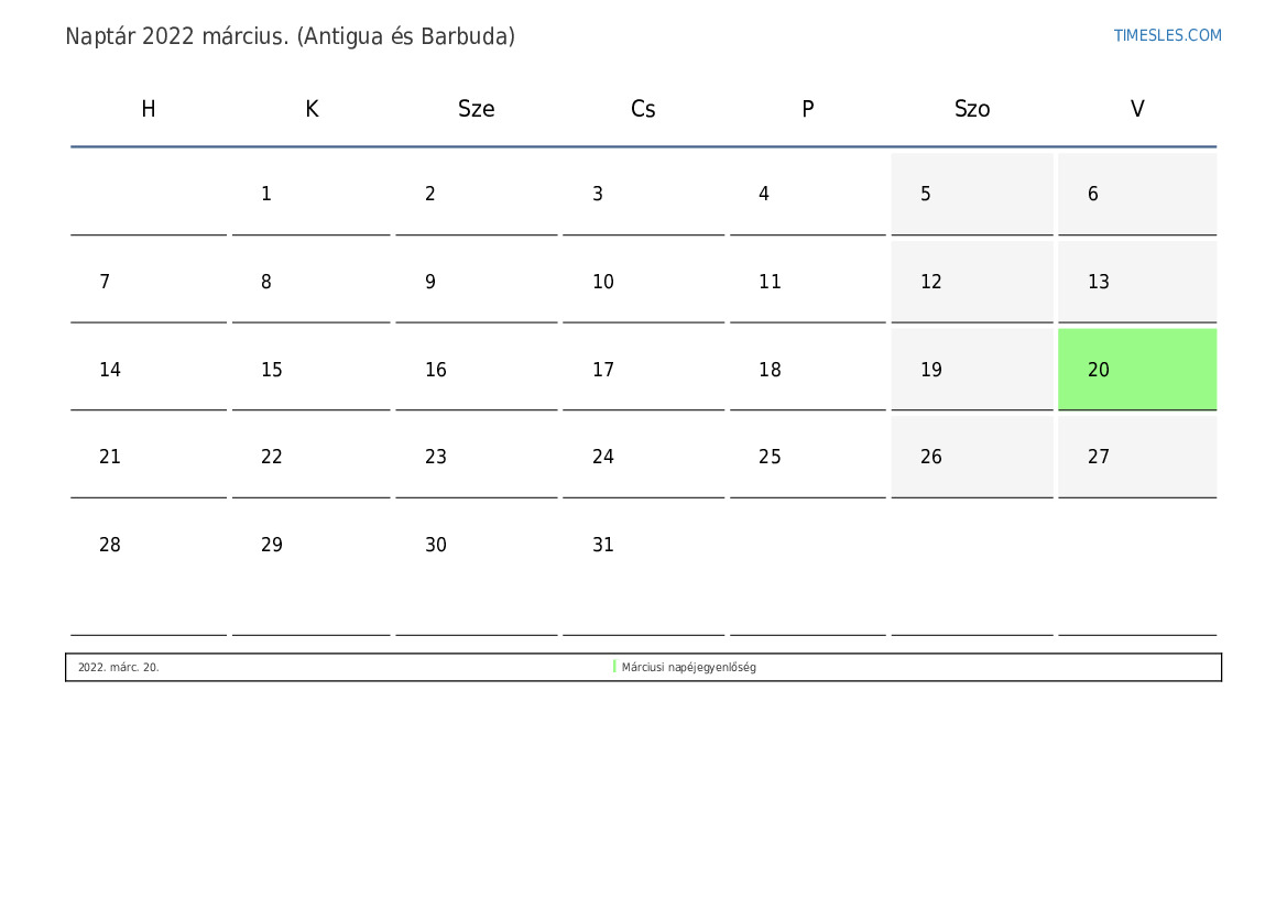 március hónapja 31 nap tartalmaz. Ez 2022 3 hónapja. Az év szezonja: tavaszi. március hónap kedden kezdődik és csütörtökön ér véget. 2022 március 1 ünnep és szabadnap van Antigua és Barbuda területén.