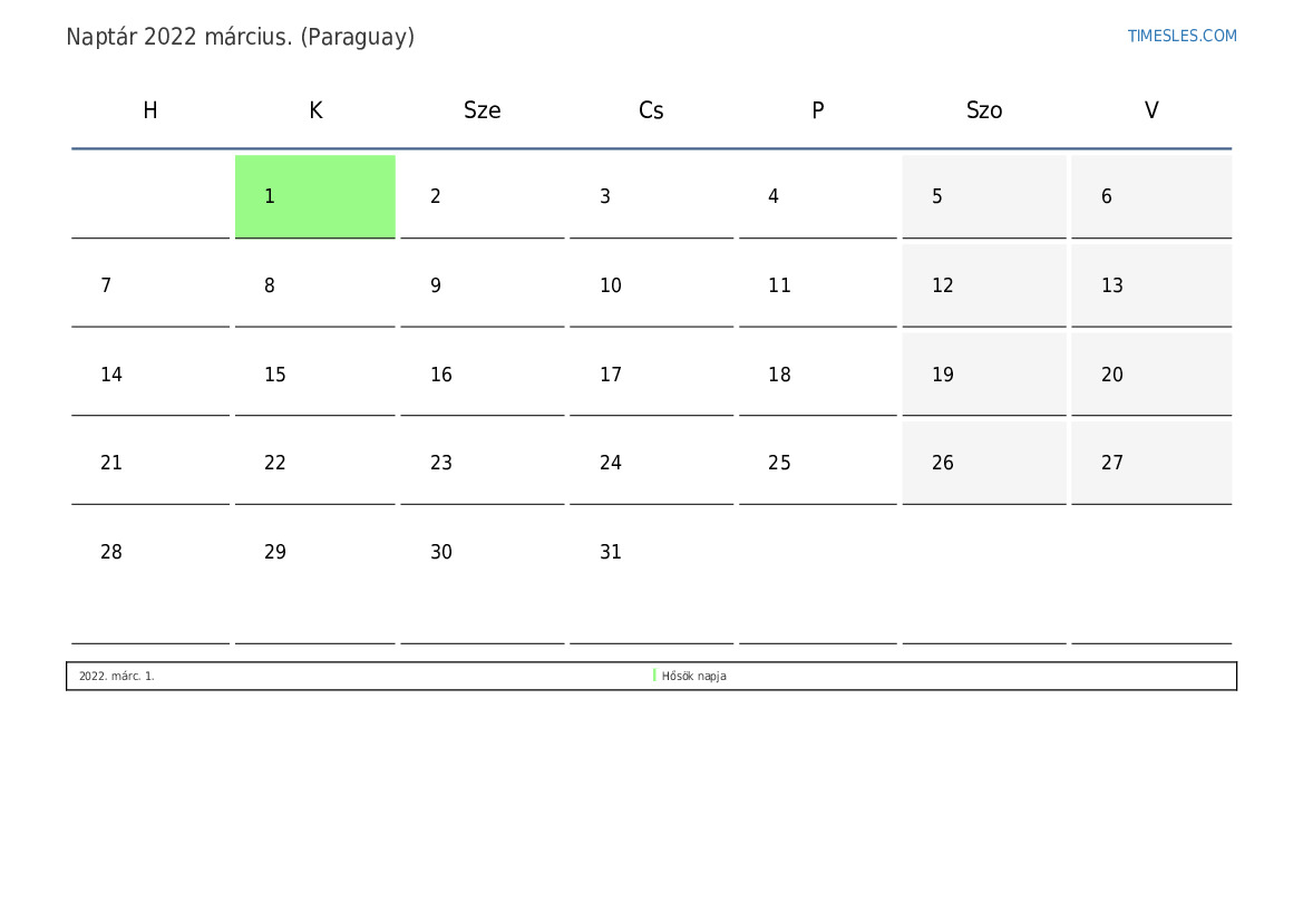 Ünnepek és hétvégi naptár 2022 március Paraguayért