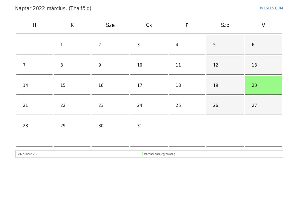 március hónapja 31 nap tartalmaz. Ez 2022 3 hónapja. Az év szezonja: tavaszi. március hónap kedden kezdődik és csütörtökön ér véget. 2022 március 1 ünnep és szabadnap van Thaiföldön.