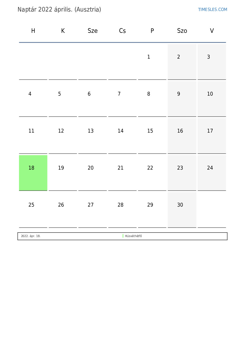 április hónapja 30 nap tartalmaz. Ez 2022 4 hónapja. Az év szezonja: tavaszi. április hónap pénteken kezdődik és szombaton ér véget. 2022 április 4 ünnep és szabadnap van Ausztriában.