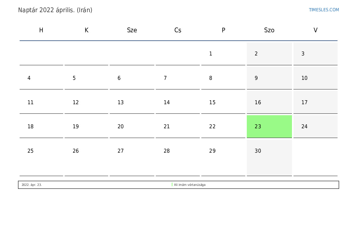 április hónapja 30 nap tartalmaz. Ez 2022 4 hónapja. Az év szezonja: tavaszi. április hónap pénteken kezdődik és szombaton ér véget. 2022 április 1 ünnep és szabadnap van Iránban.