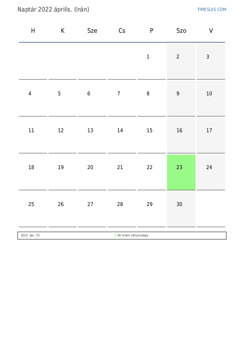 Ünnepek és hétvégi naptár 2022 április Irán számára