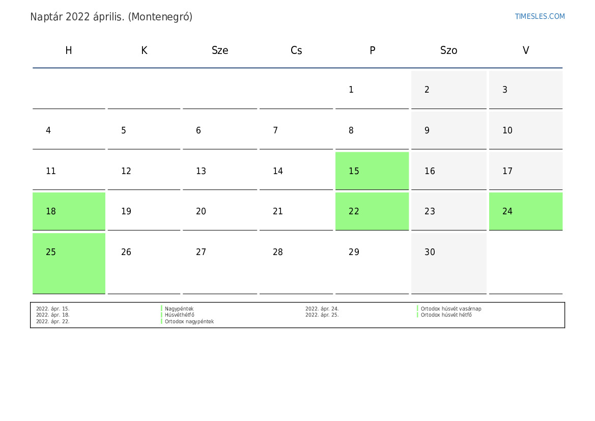 PDF naptár letöltése és nyomtatása ünnepekkel és hétvégékkel 2022 április Montenegró számára