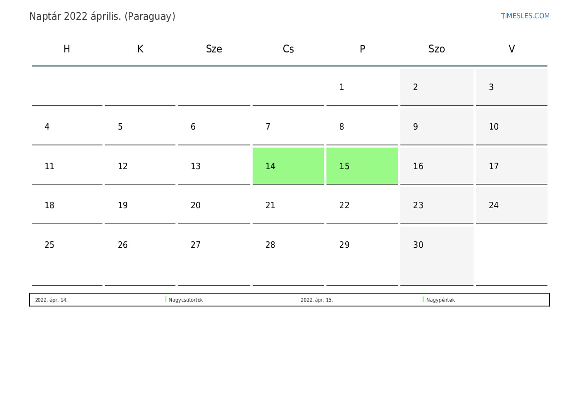 PDF naptár letöltése és nyomtatása ünnepekkel és hétvégékkel 2022 április Paraguayért