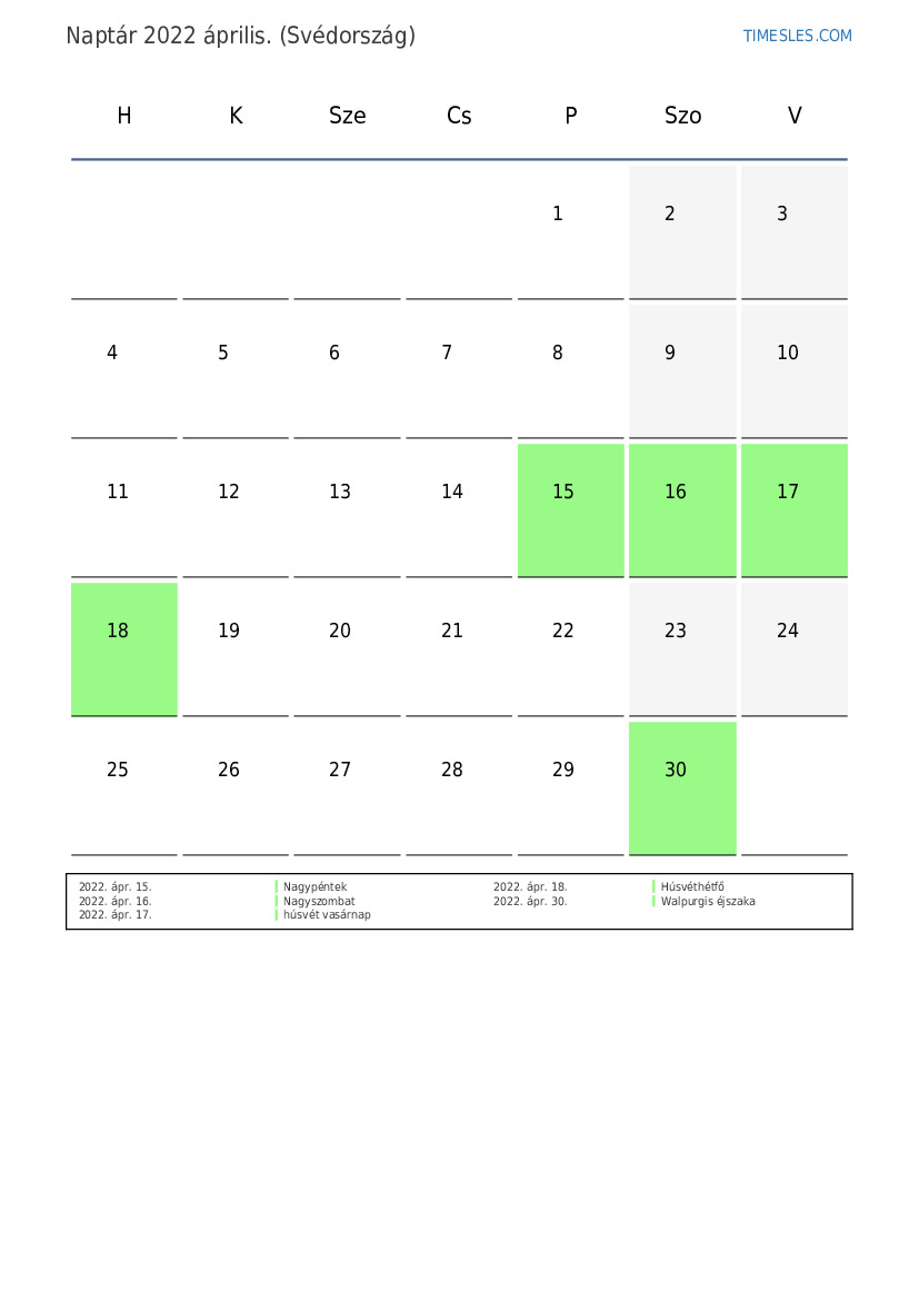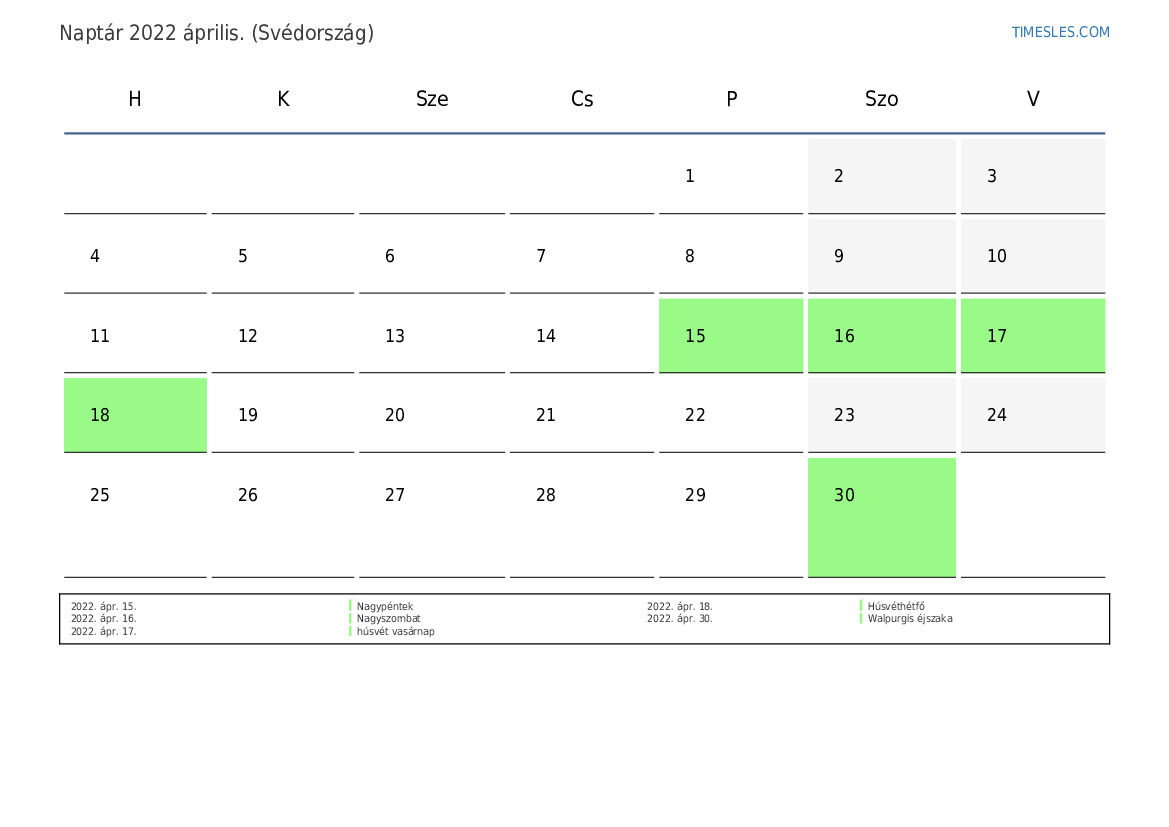 Ünnepek és hétvégi naptár 2022 április Svédország számára
