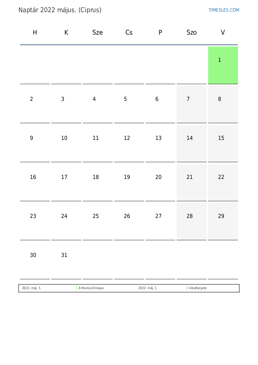 Ünnepek és hétvégi naptár 2022 május Ciprus számára