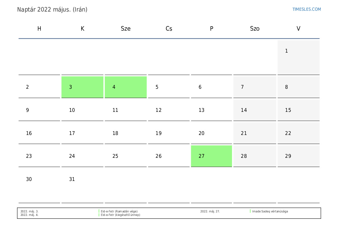Ünnepek és hétvégi naptár 2022 május Irán számára