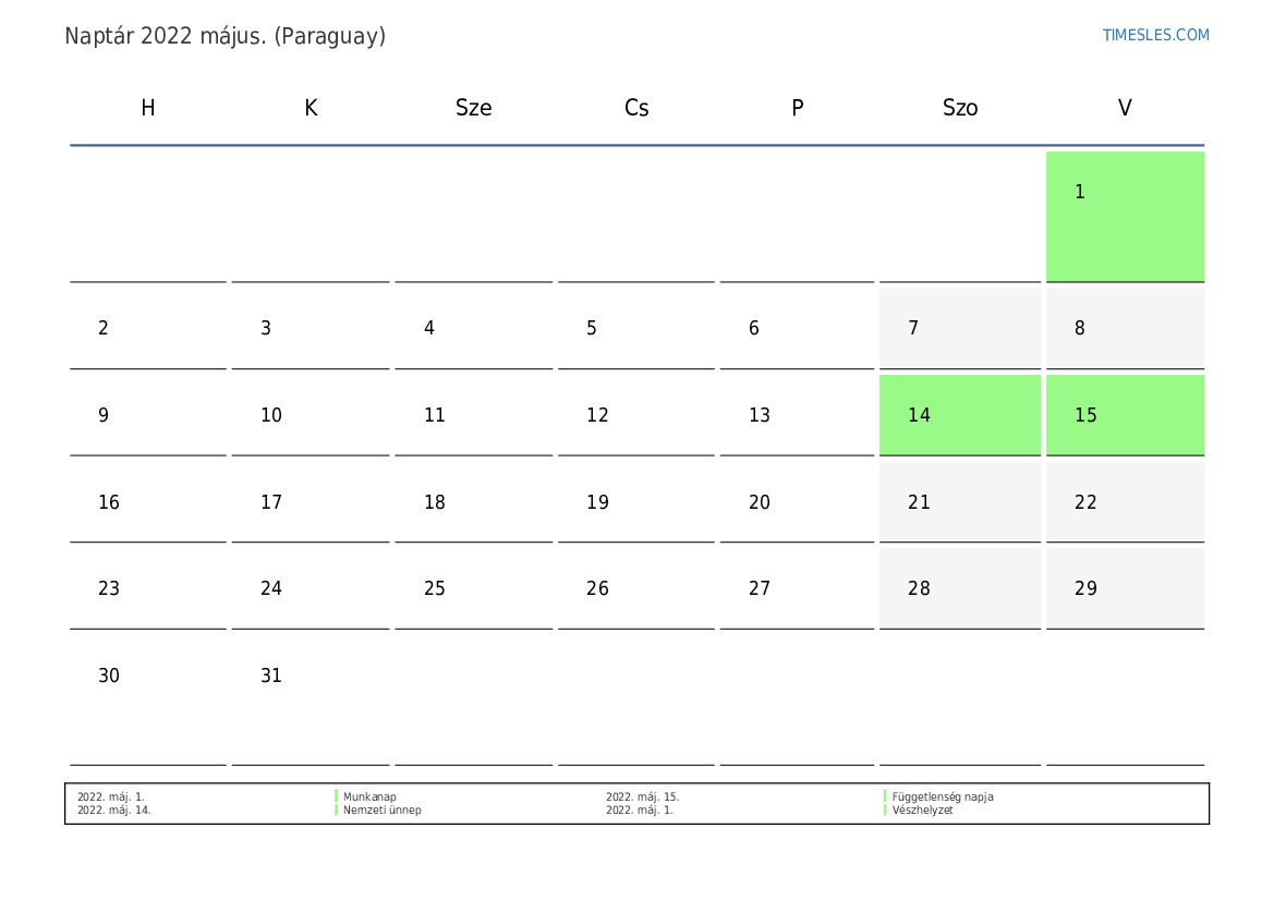 Ünnepek és hétvégi naptár 2022 május Paraguayért