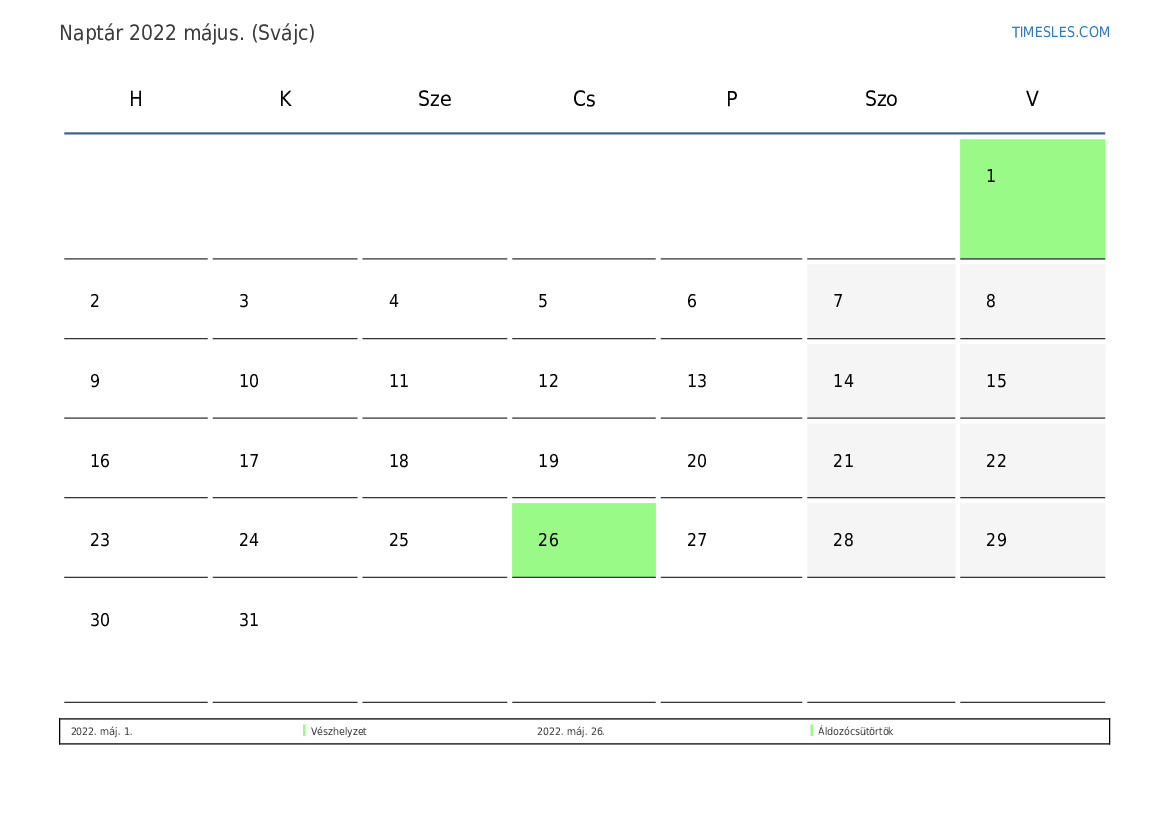 Ünnepek és hétvégi naptár 2022 május Svájcért