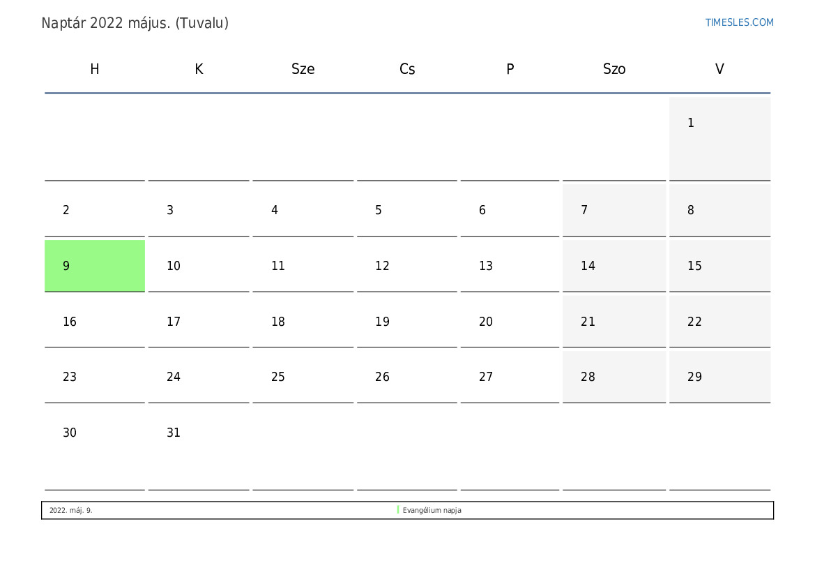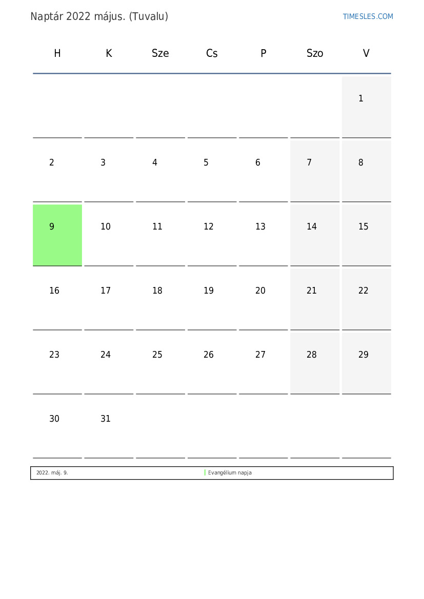 Ünnepek és hétvégi naptár 2022 május Tuvalu számára