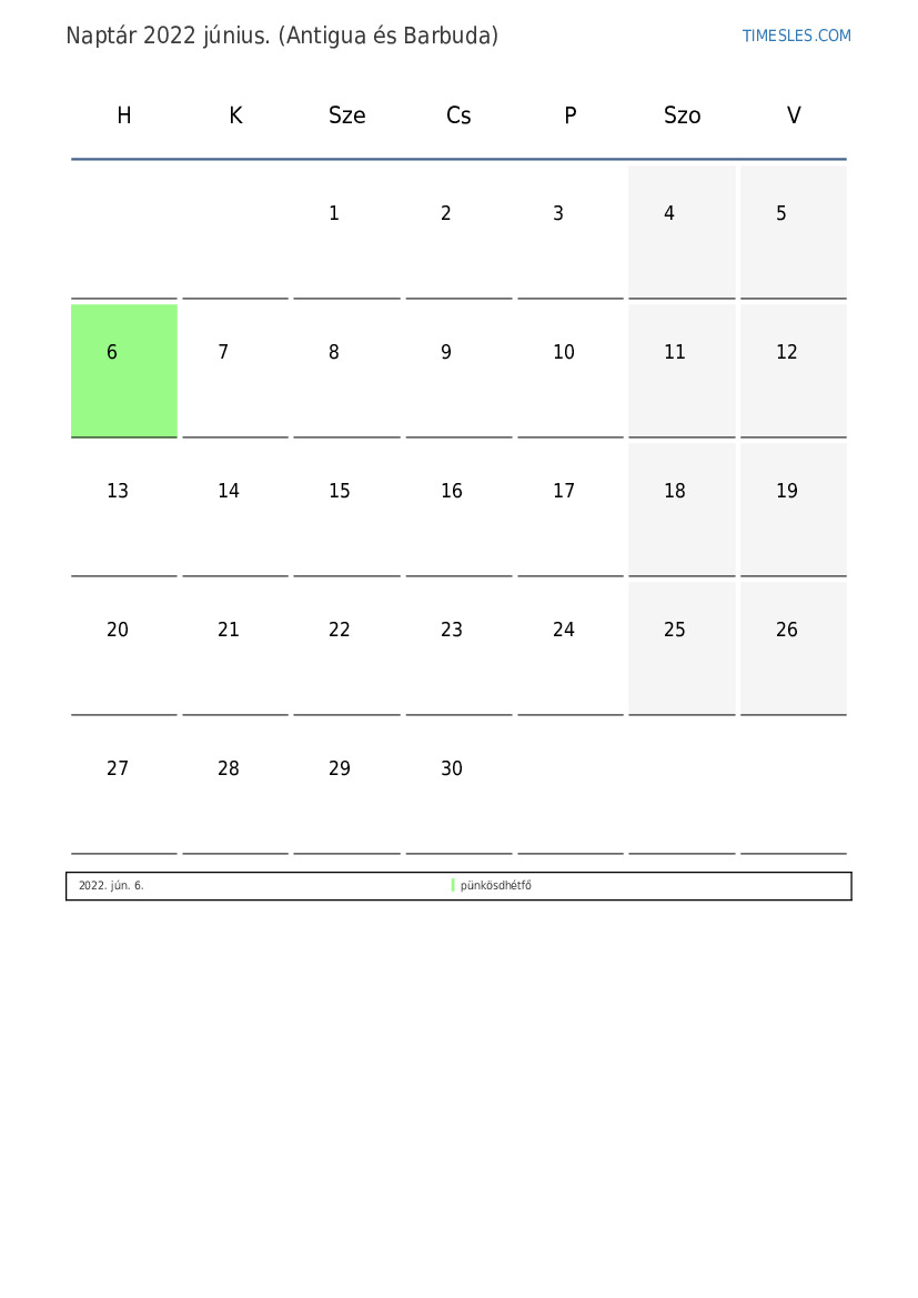 június hónapja 30 nap tartalmaz. Ez 2022 6 hónapja. Az év szezonja: nyár. június hónap szerdán kezdődik és csütörtökön ér véget. 2022 június 2 ünnep és szabadnap van Antigua és Barbuda területén.