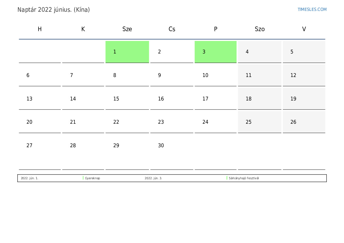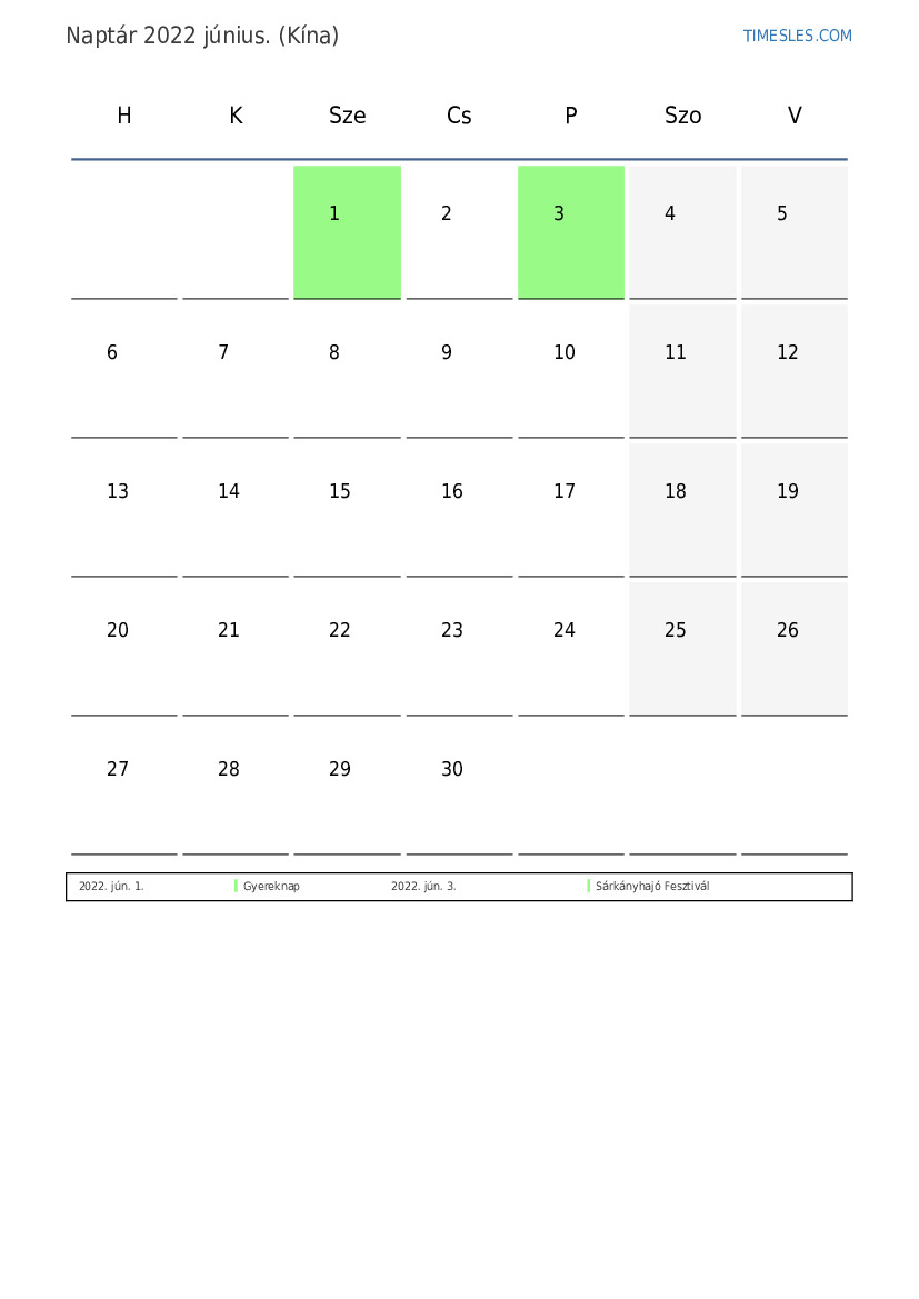 Ünnepek és hétvégi naptár 2022 június Kína számára