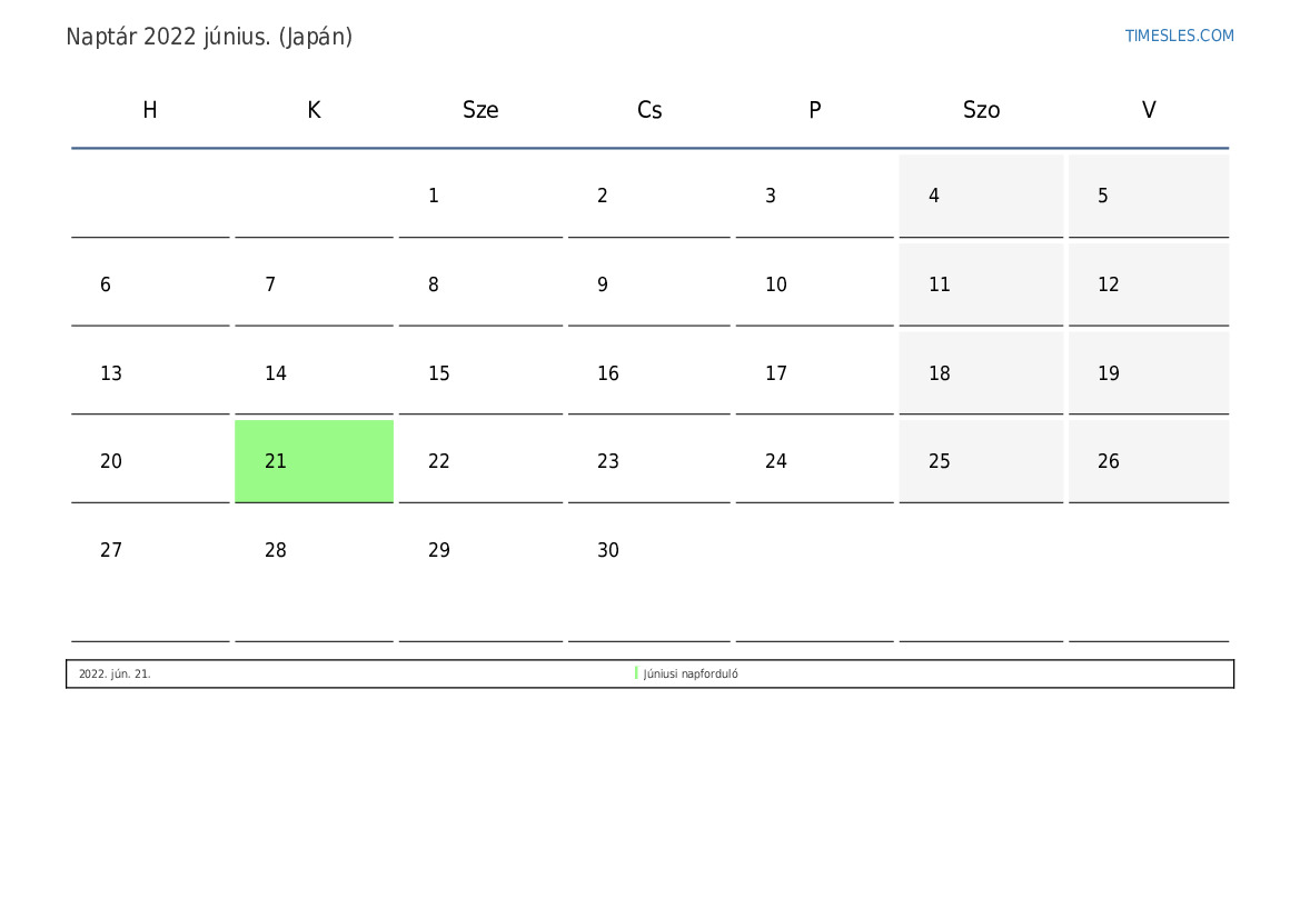 Ünnepek és hétvégi naptár 2022 június Japán számára
