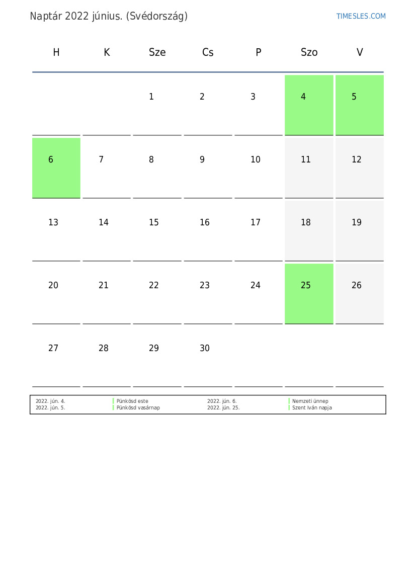 Ünnepek és hétvégi naptár 2022 június Svédország számára