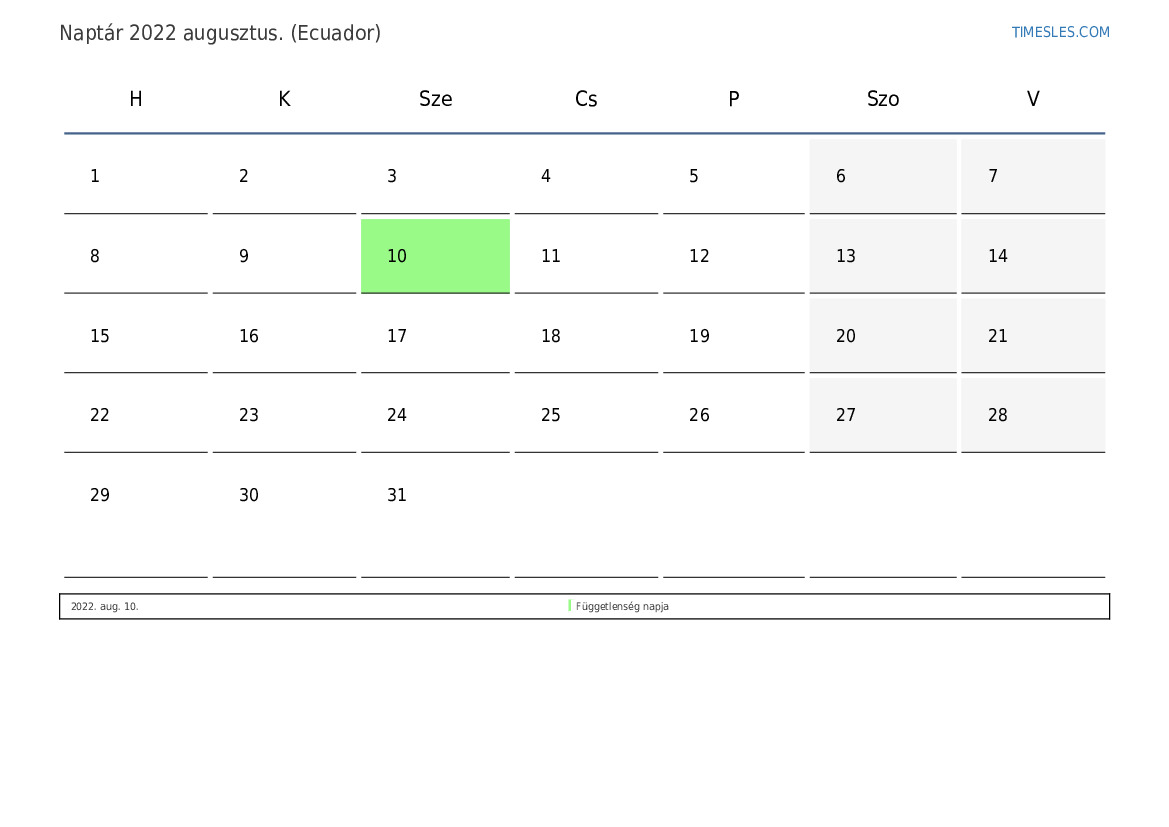 PDF naptár letöltése és nyomtatása ünnepekkel és hétvégékkel 2022 augusztus Ecuadorért