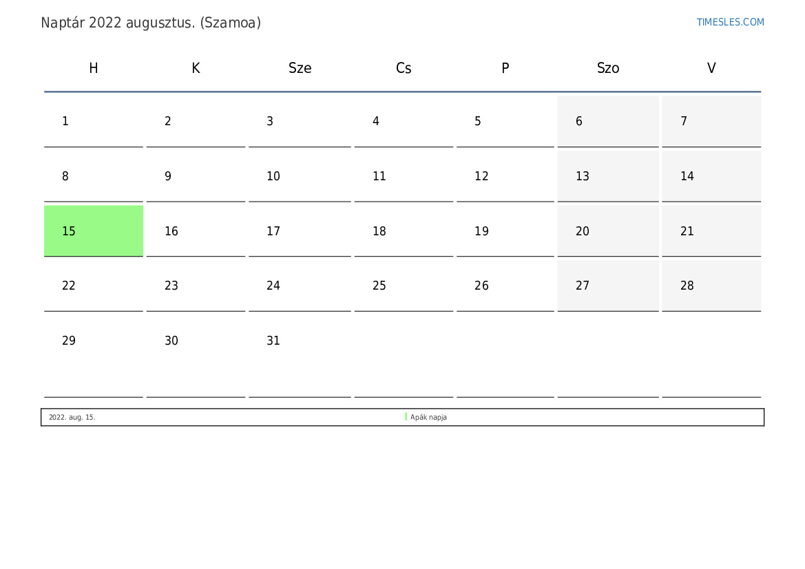 augusztus hónapja 31 nap tartalmaz. Ez 2022 8 hónapja. Az év szezonja: nyár. augusztus hónap hétfőn kezdődik és szerdán ér véget. 2022 augusztus 1 ünnep és szabadnap van Szamoa-ban.