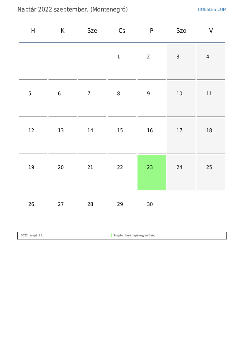 szeptember hónapja 30 nap tartalmaz. Ez 2022 9 hónapja. Az év szezonja: ősz. szeptember hónap csütörtökön kezdődik és pénteken ér véget. 2022 szeptember 1 ünnep és szabadnap van Montenegróban.