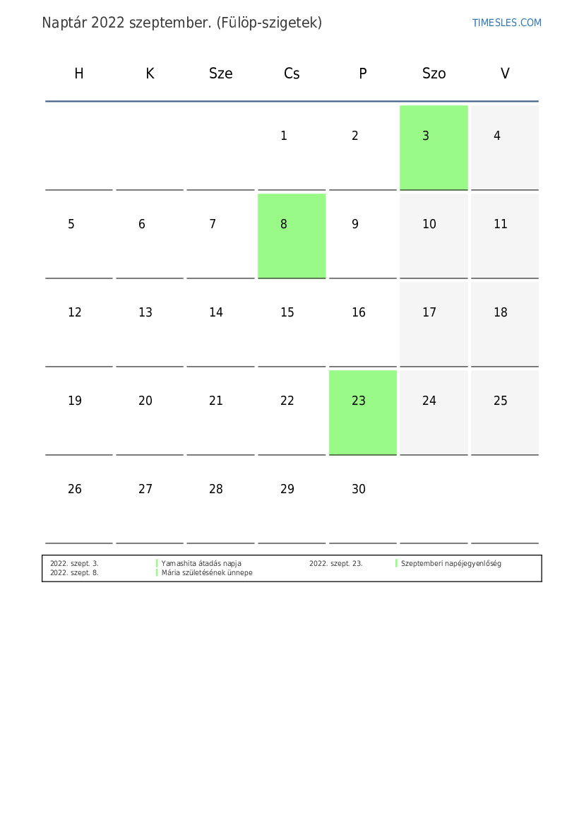 szeptember hónapja 30 nap tartalmaz. Ez 2022 9 hónapja. Az év szezonja: ősz. szeptember hónap csütörtökön kezdődik és pénteken ér véget. 2022 szeptember 3 ünnep és szabadnap van Fülöp-szigeteken.