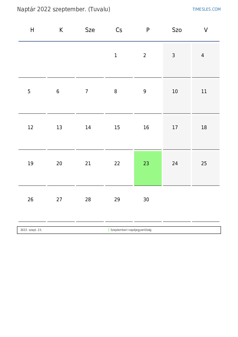 szeptember hónapja 30 nap tartalmaz. Ez 2022 9 hónapja. Az év szezonja: ősz. szeptember hónap csütörtökön kezdődik és pénteken ér véget. 2022 szeptember 1 ünnep és szabadnap van Tuvaluban.