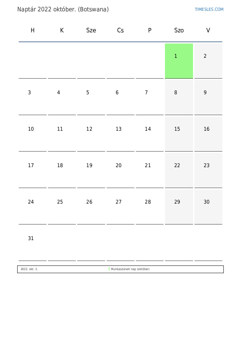 október hónapja 31 nap tartalmaz. Ez 2022 10 hónapja. Az év szezonja: ősz. október hónap szombaton kezdődik és hétfőn ér véget. 2022 október 1 ünnep és szabadnap van Botswanában.