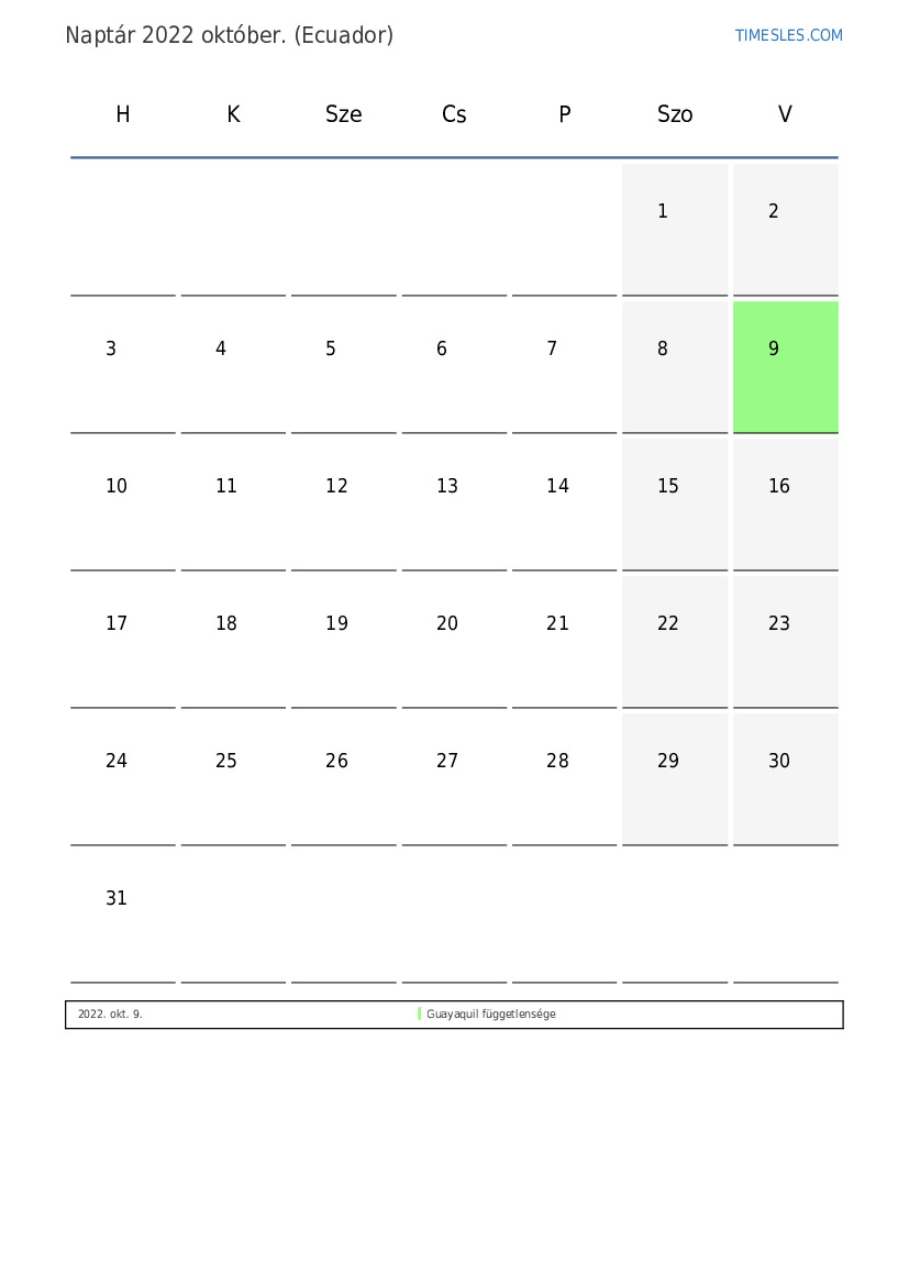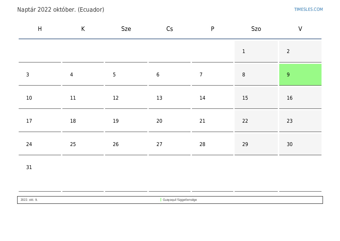 PDF naptár letöltése és nyomtatása ünnepekkel és hétvégékkel 2022 október Ecuadorért