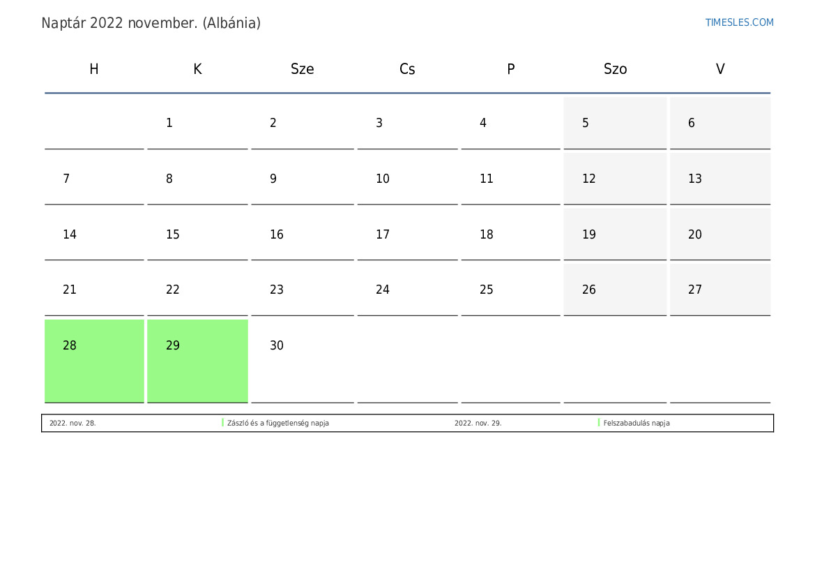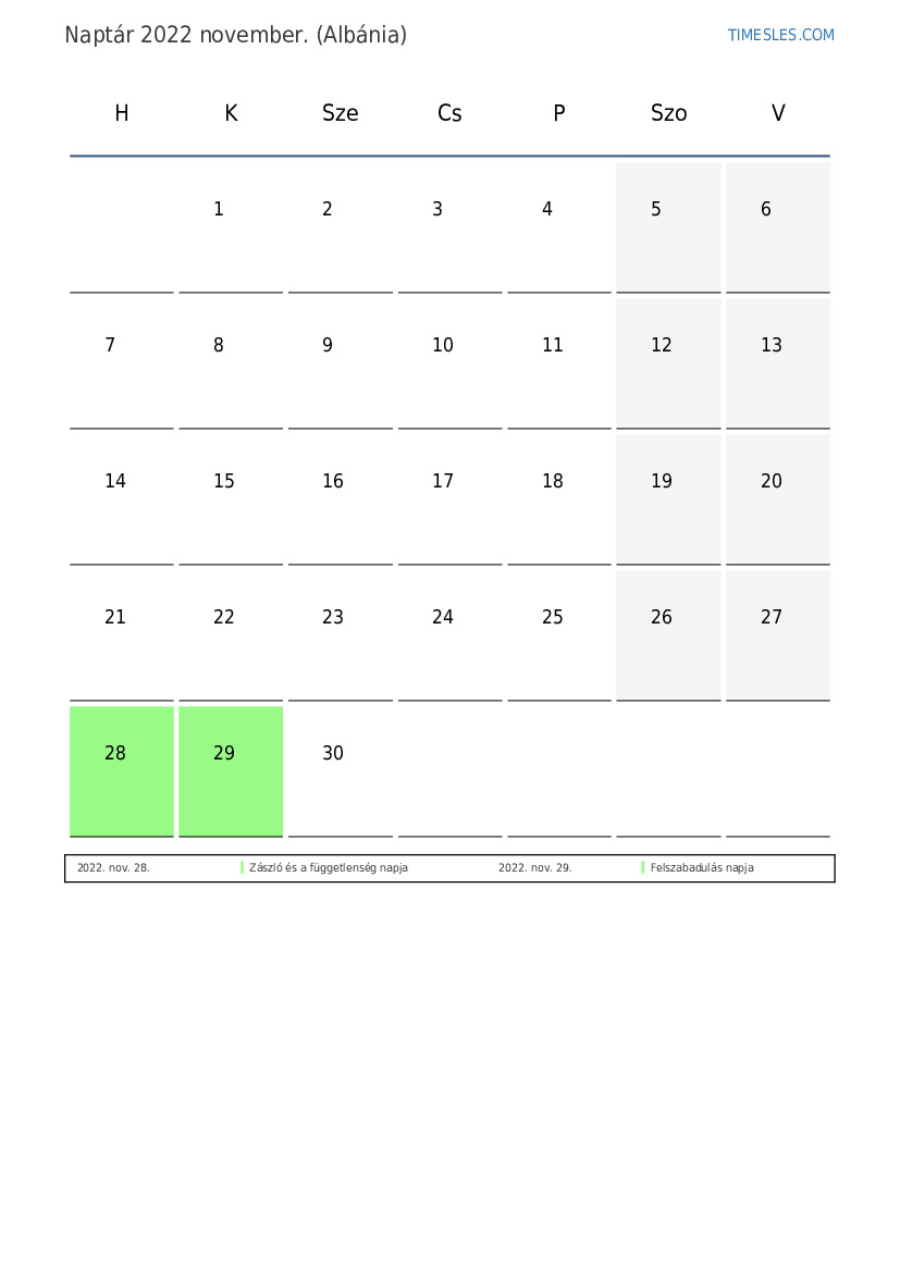 Ünnepek és hétvégi naptár 2022 november Albánia számára