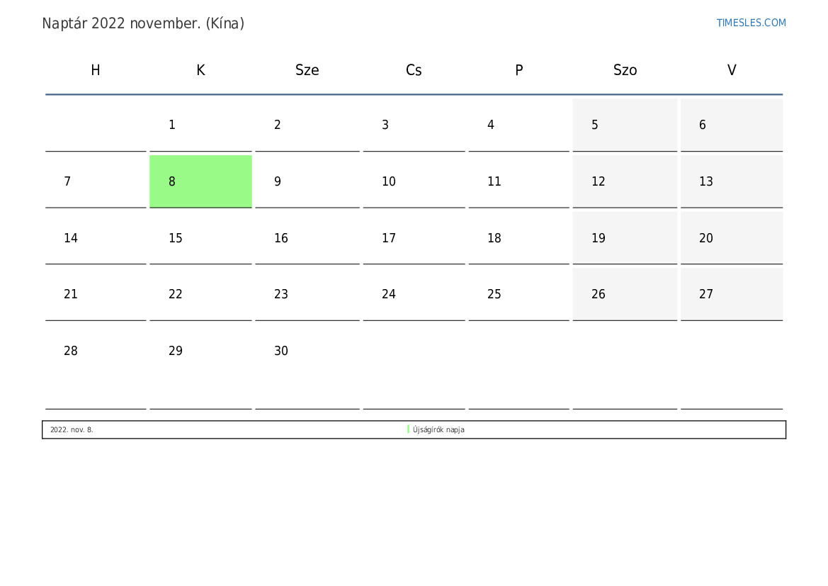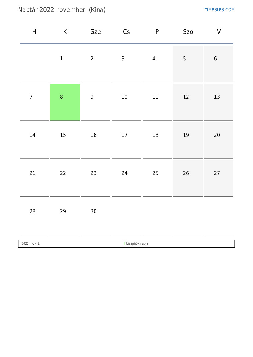 PDF naptár letöltése és nyomtatása ünnepekkel és hétvégékkel 2022 november Kína számára