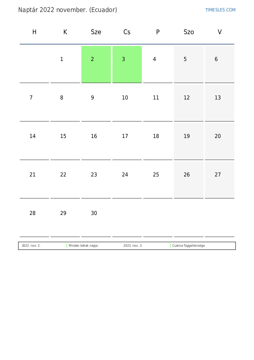 PDF naptár letöltése és nyomtatása ünnepekkel és hétvégékkel 2022 november Ecuadorért