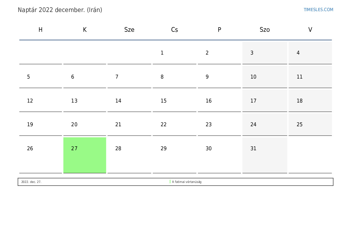 Ünnepek és hétvégi naptár 2022 december Irán számára