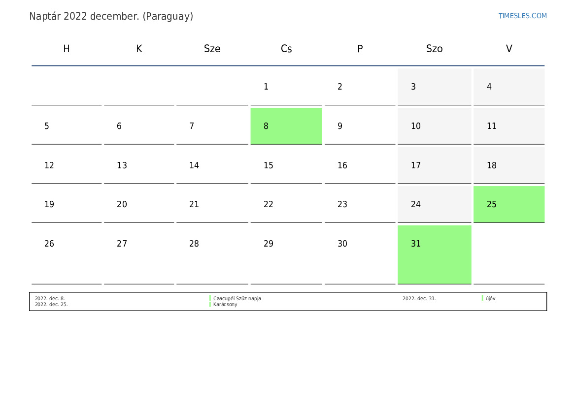 Ünnepek és hétvégi naptár 2022 december Paraguayért