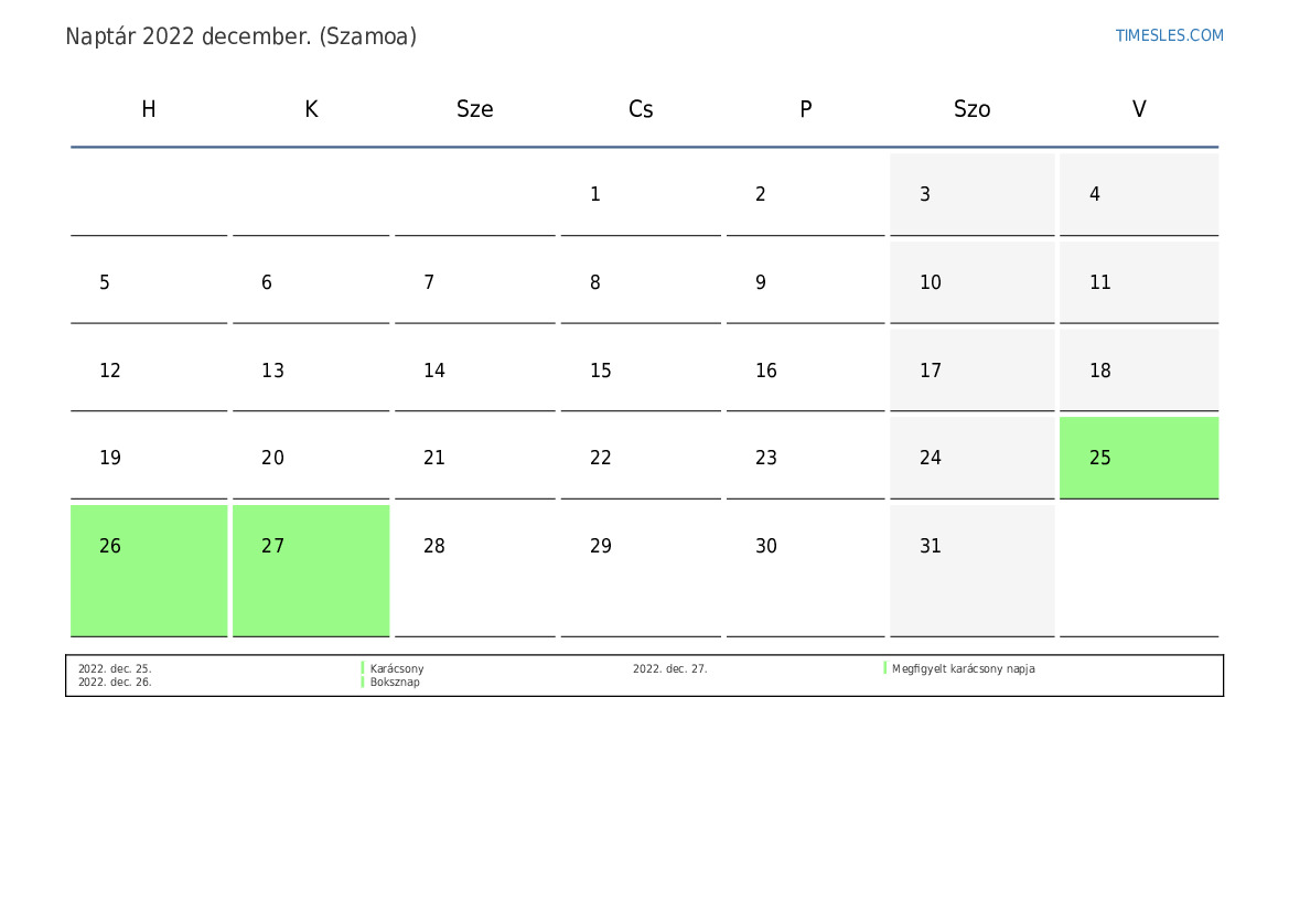 Ünnepek és hétvégi naptár 2022 december Szamoa számára