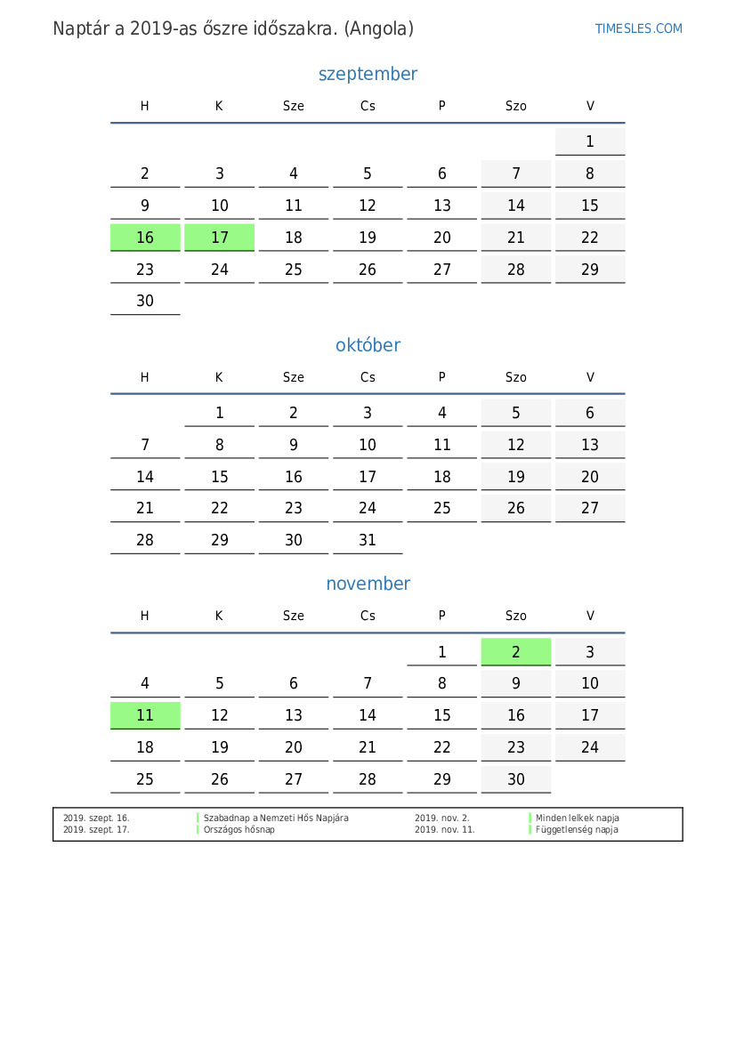 Töltse le és nyomtassa ki az ünnepnapokkal és hétvégékkel ellátott PDF naptárat Angolának 2019 őszre