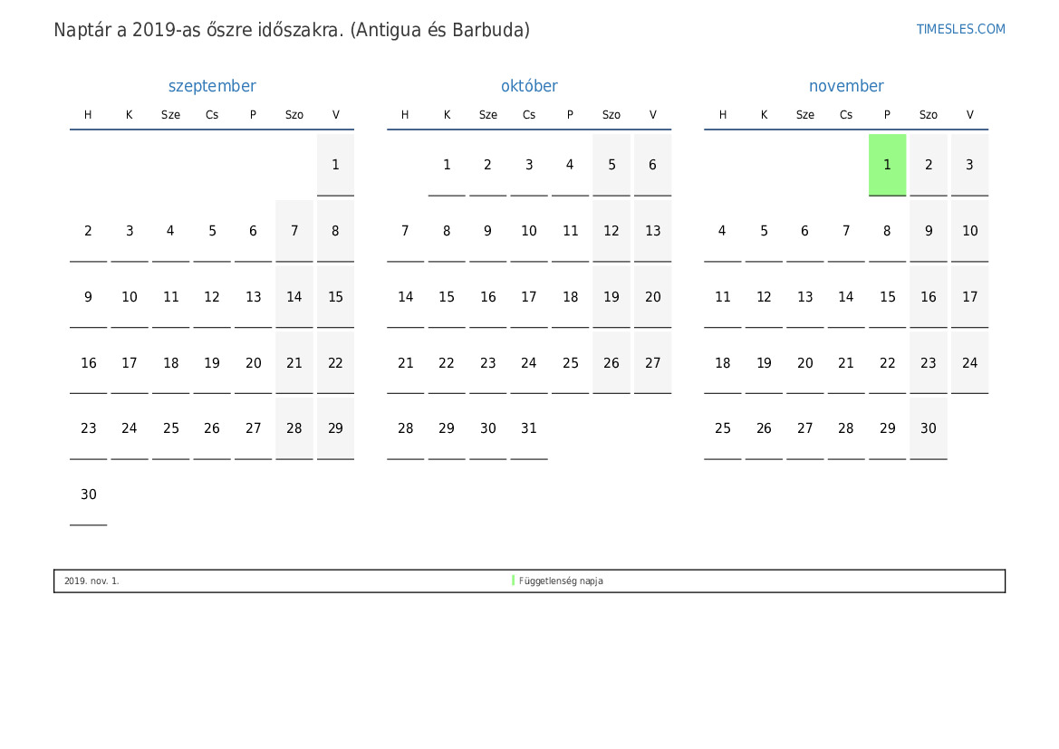 Töltse le és nyomtassa ki az ünnepnapokkal és hétvégékkel ellátott PDF naptárat Antigua és Barbuda számára 2019 őszre