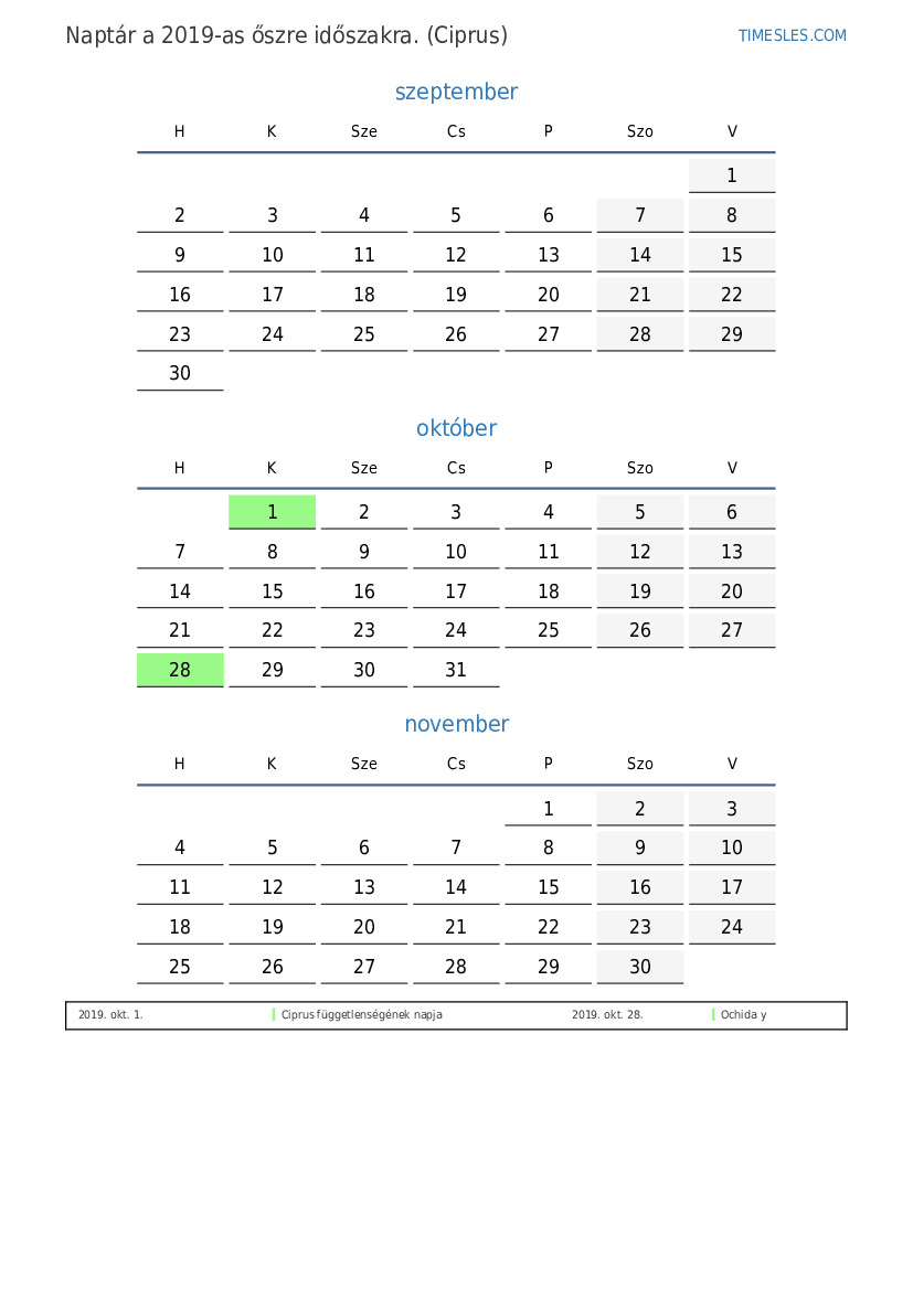 Töltse le és nyomtassa ki az ünnepnapokkal és hétvégékkel ellátott PDF naptárat Ciprus számára 2019 őszre