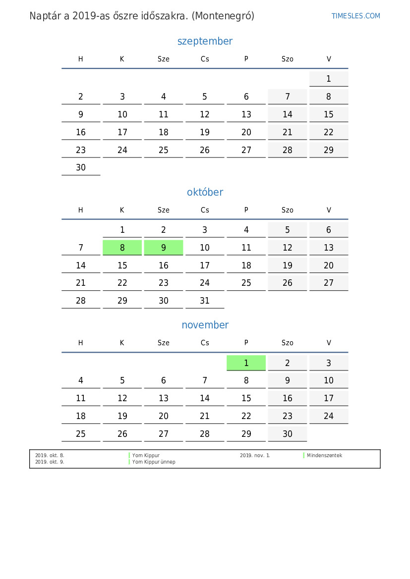 Töltse le és nyomtassa ki az ünnepnapokkal és hétvégékkel ellátott PDF naptárat Montenegró számára 2019 őszre