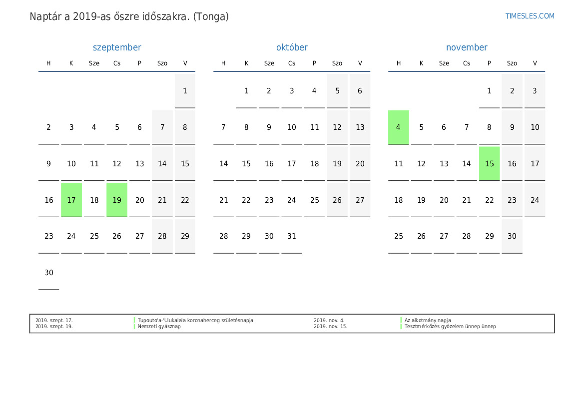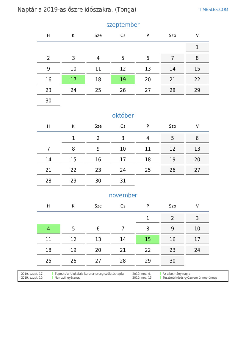 Ünnepnapok és hétvégék 2019 őszre Tongának