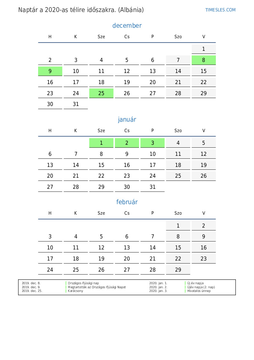 Ünnepnapok és hétvégék 2020 őszre Albánia számára