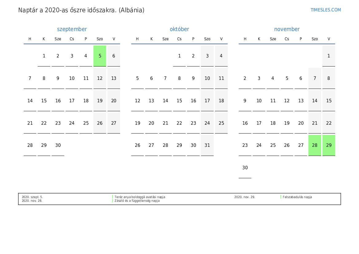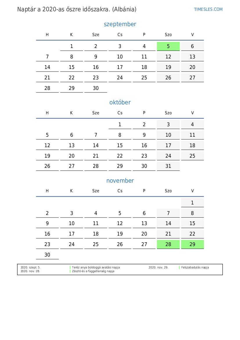 Töltse le és nyomtassa ki az ünnepnapokkal és hétvégékkel ellátott PDF naptárat Albánia számára 2020 őszre