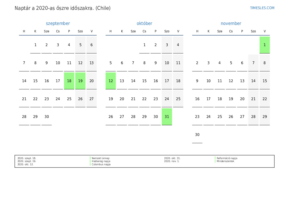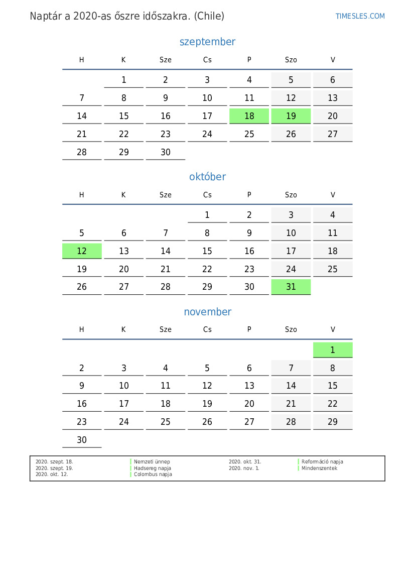 Töltse le és nyomtassa ki az ünnepnapokkal és hétvégékkel ellátott PDF naptárat Chile számára 2020 őszre