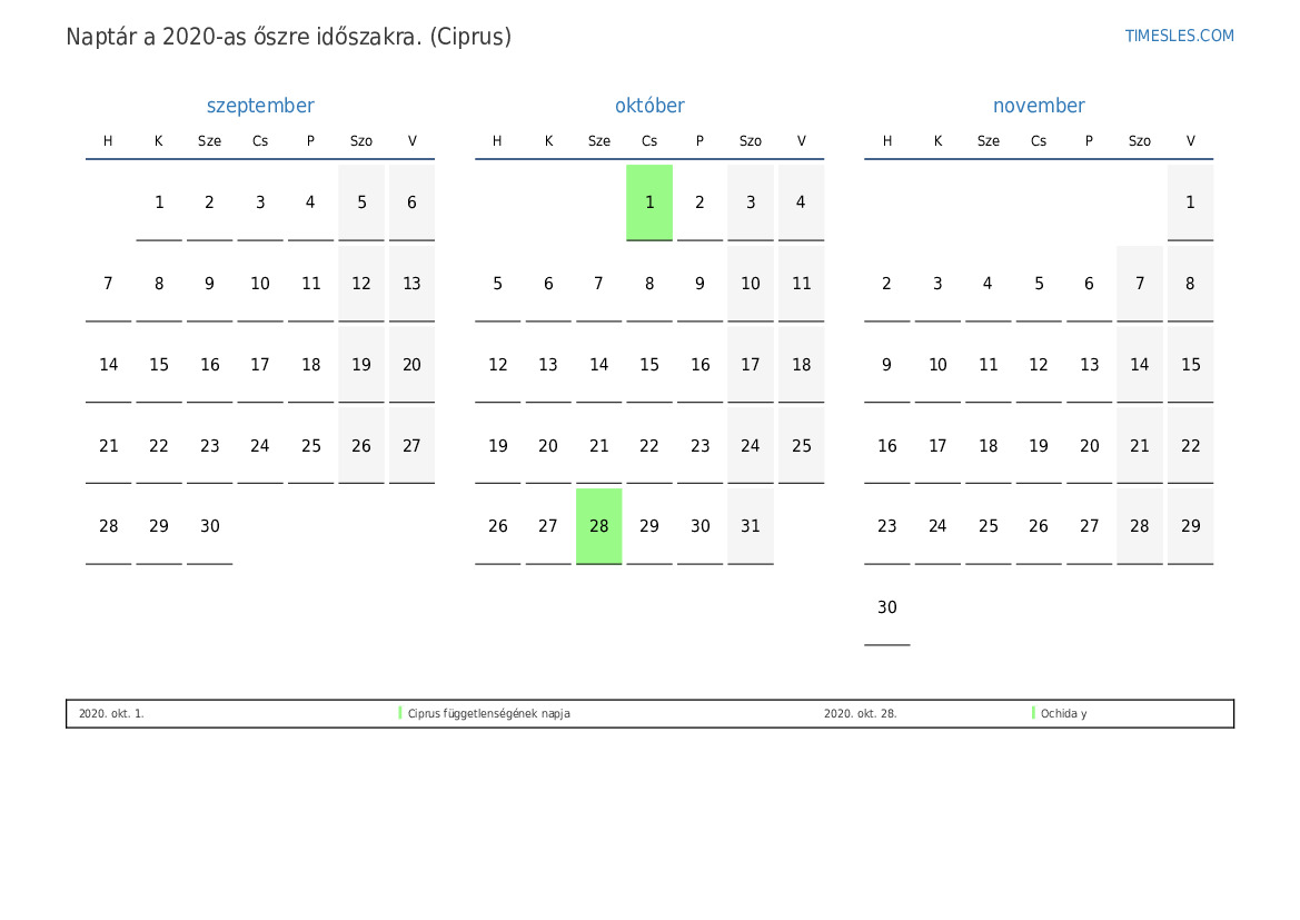 Töltse le és nyomtassa ki az ünnepnapokkal és hétvégékkel ellátott PDF naptárat Ciprus számára 2020 őszre