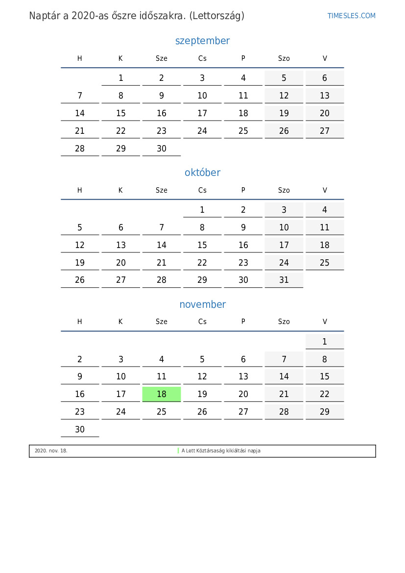 Töltse le és nyomtassa ki az ünnepnapokkal és hétvégékkel ellátott PDF naptárat Lettország számára 2020 őszre