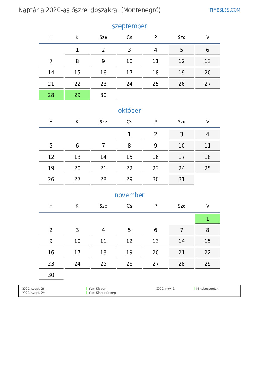 Töltse le és nyomtassa ki az ünnepnapokkal és hétvégékkel ellátott PDF naptárat Montenegró számára 2020 őszre