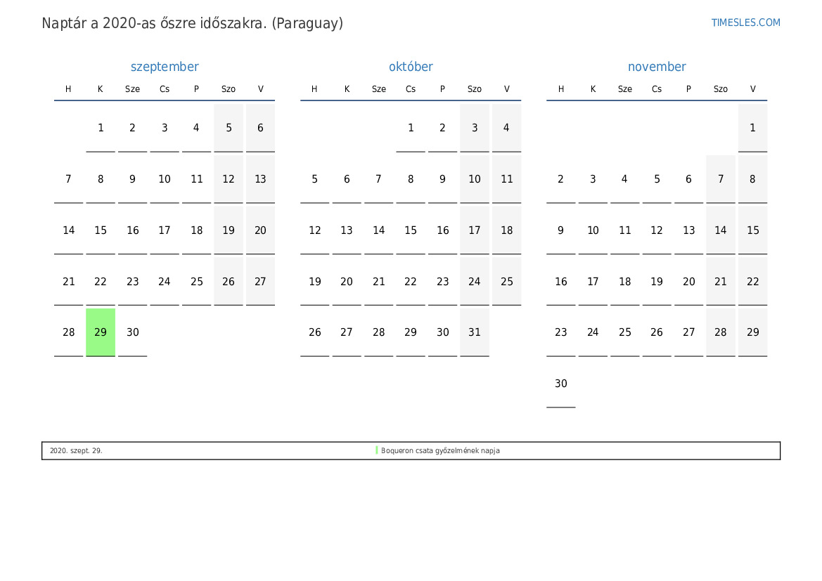 Töltse le és nyomtassa ki az ünnepnapokkal és hétvégékkel ellátott PDF naptárat Paraguayért 2020 őszre