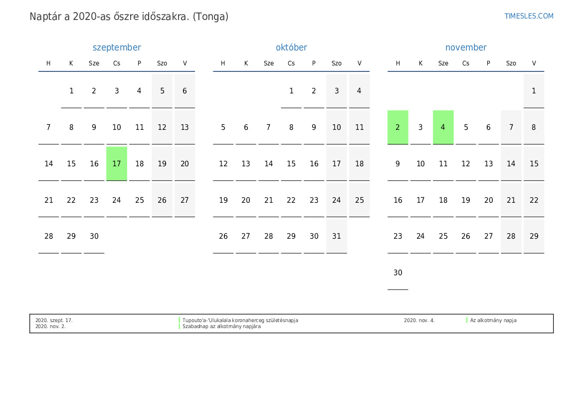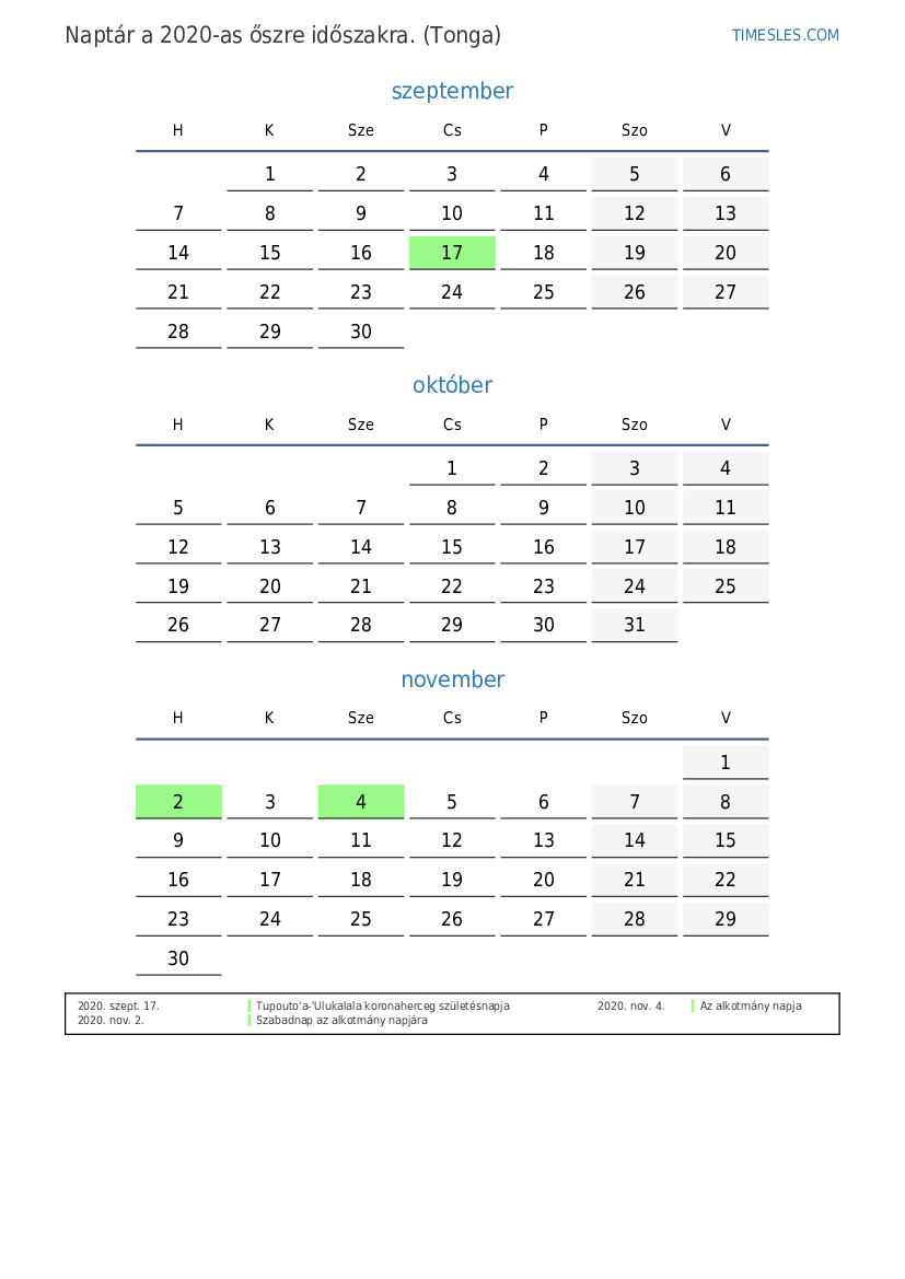 Ünnepnapok és hétvégék 2020 őszre Tongának