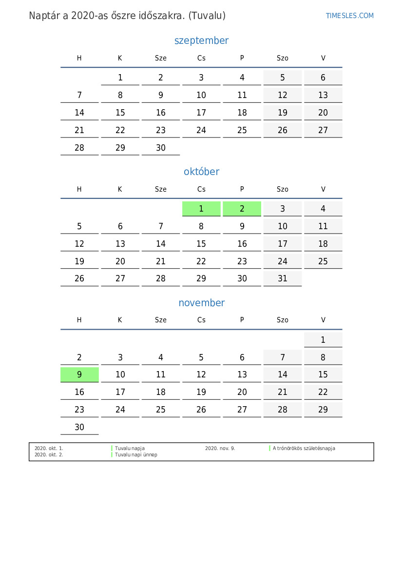 Töltse le és nyomtassa ki az ünnepnapokkal és hétvégékkel ellátott PDF naptárat Tuvalu számára 2020 őszre