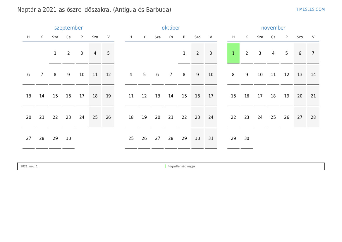 Töltse le és nyomtassa ki az ünnepnapokkal és hétvégékkel ellátott PDF naptárat Antigua és Barbuda számára 2021 őszre