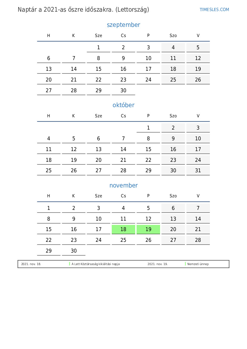 2021-es őszre naptár Lettország számára