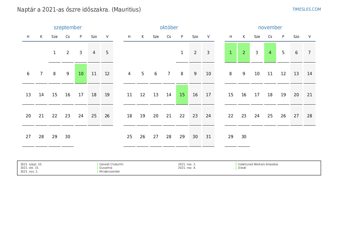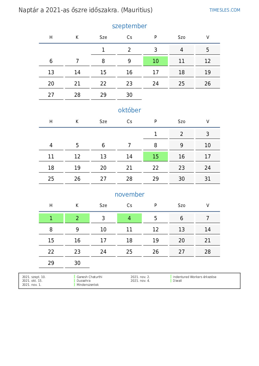 Töltse le és nyomtassa ki az ünnepnapokkal és hétvégékkel ellátott PDF naptárat Mauritius számára 2021 őszre